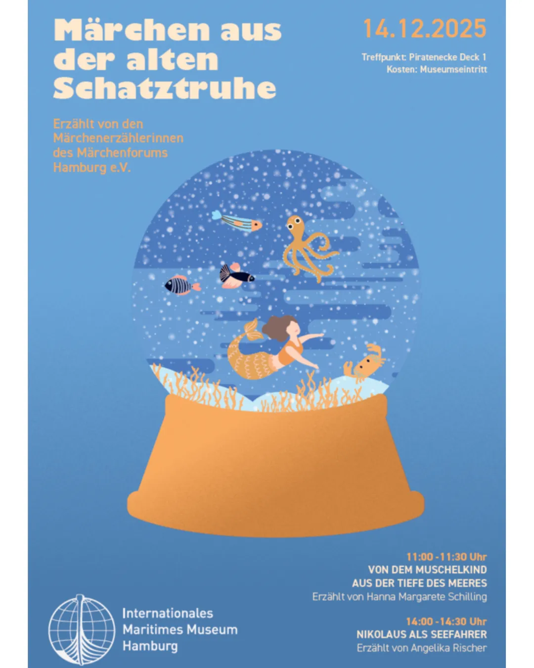 Am 14.12. bekommen wir besonderen Besuch: Die Märchenerzählerinnen des Märchenforums Hamburg e.V. öffnen ihre Schatztruhe und laden Kinder und Erwachsene zu zwei Erzählstunden ein. 11:00–11:30 Uhr „Von dem Muschelkind aus der Tiefe des Meeres“ erzählt von Hanna Margarete Schilling 14:00–14:30 Uhr „Nikolaus als Seefahrer“ erzählt von Angelika Rischer Im Anschluss können Kinder eigene magische Buttons gestalten. Es fallen lediglich die Eintrittskosten an, Anmeldungen gerne über: https://www.imm-hamburg.de/maerchenstunde-im-museum/